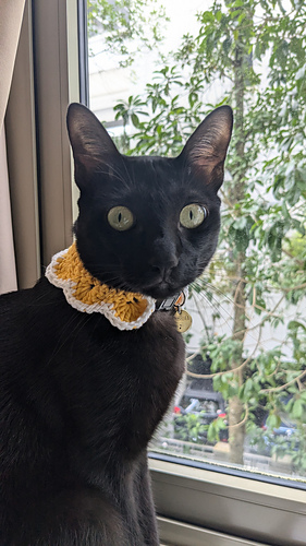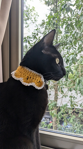 As with all objects made of yarn, it is essential to know your pet’s behaviors well before you let them wear crocheted or knitted clothing. Please supervise them carefully to avoid any risk of the yarn being ingested! My cat only wears the crocheted collar when I am at home with her.