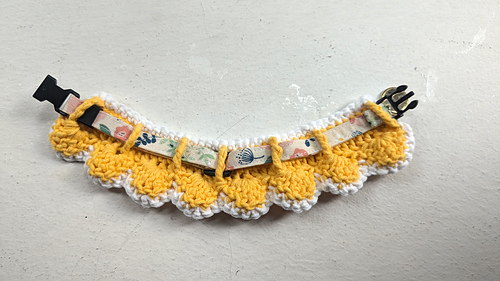 This pattern makes a decorative sleeve with a scalloped bottom edge and contrast border for a small cat or dog collar. The sleeve has loops on the back side which enable it to be worn over an existing collar.