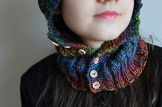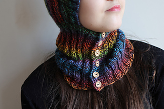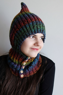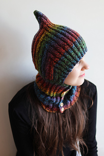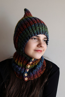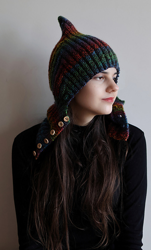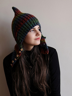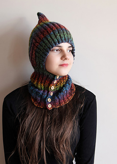 Single-layer pixie balaclava in worsted weight with a bold pointed crown and ribbed front-button neck piece. Exceptional with variegated yarn. Knit flat throughout — no circular knitting required.