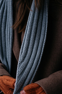 The scarf was knitted in Kremke Merry Merino 140 on 3.5 mm (US 4) needles, with an approximate gauge of 24 sts × 26 rows = 10 × 10 cm / 4 × 4” in lightly stretched 3×3 rib.