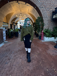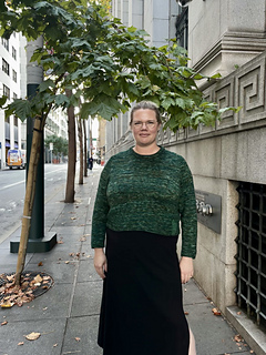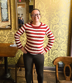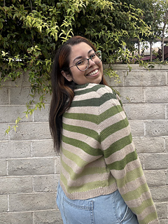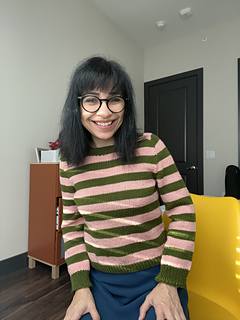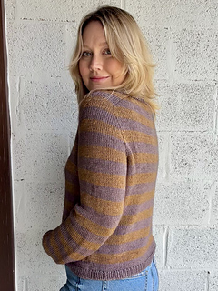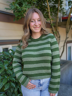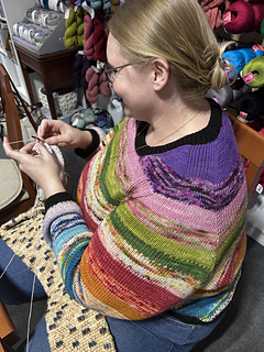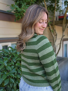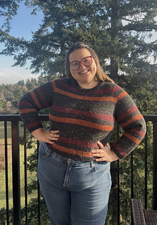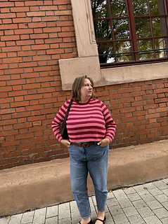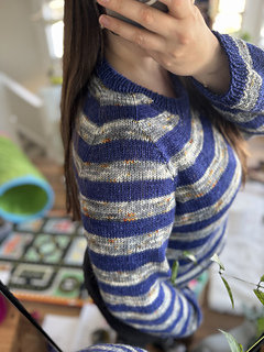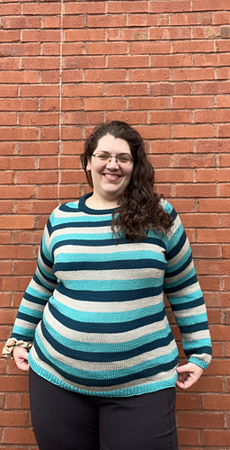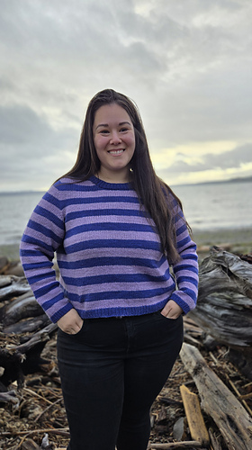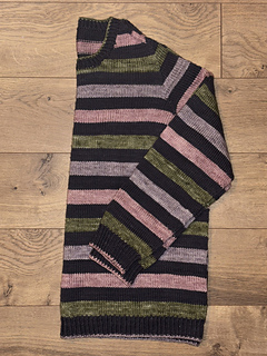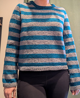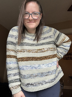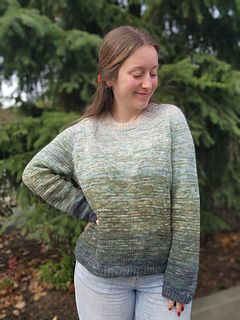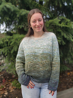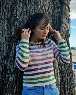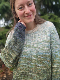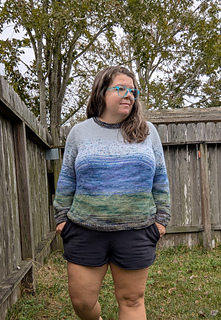 The Scorned Sweater is a DK weight sweater worked in stockinette, with the option to be knit solid, in stripes, or in a fade. This is designed in collaboration with Pasley Knits and their A Woman Scorned advent boxes for 2025, with the intention of a stripe version worked for the tonal boxes and the fade version worked for the variegated boxes. You could also work a solid version in one colour. The yoke is constructed using a contiguous saddle shoulder method to shape the shoulders first, then sleeve increases, and then raglan increases. The yoke section is worked to an upper bust measurement, and the body has some additional increases to the full bust measurement (size dependent). The folded collar, cuffs and hem are worked in 1x1 ribbing. The sweater is designed to fall to a high hip level. The pattern is intended to be a boxy fit, but has options for waist shaping if desired, as well as adjusting length as needed for the body and sleeves. This is a size inclusive design, written for 11 sizes (30-70 inch / 75-175 cm finished bust, in 4 inch / 10 cm increments) and designed for 2-6 inches / 5-15 cm of positive ease.