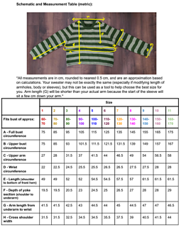 Note: The sizes reflect the FINISHED bust measurements in inches / cm of the sweater, and listed below you can see the recommended actual bust range for each size. The sweater is designed for 2-6 inches / 5-15 cm of positive ease. To determine the size you wish to knit, measure your bust and add 2-6 inches / 5-15 cm to find the closest size. If your upper and full bust measurements fall into different sizes, you may wish to choose size based on upper bust, as the additional increases in the body to the full bust measurement are easily adjustable. My sample is knit with about 5 inches / 12.5 cm of positive ease (Size 4 on a 37 inch / 92.5 cm bust and 30 inch / 75 cm waist).