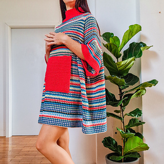 The Scrappy Stripe Dress is an oversized, seamless raglan dress worked from the top down. It features a deep cowl neck, front patch pocket, and wide sleeves — perfect for layering or wearing solo.