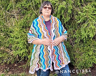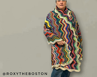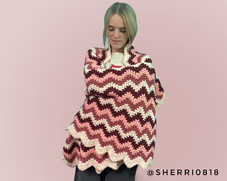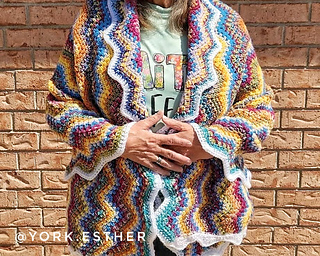 You may have seen this wave stitch in other projects, but what makes this version unique is that the waves run vertically and the most outstanding feature is the zig zag border finishing off all 4 edges. Turn the border back to create a shawl collar that frames the face so beautifully.
