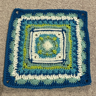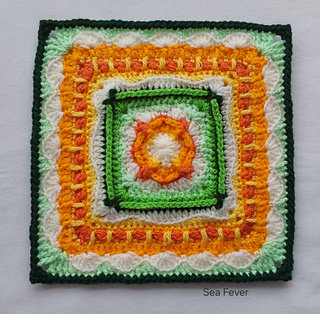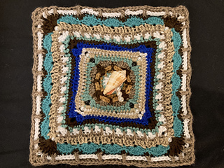 The colours of the larger square reflect the the shoreline on a hot summer’s day, and the stitch patterns hint at lapping surf, shells, ropes, driftwood… we can dream!