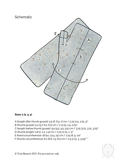 There are four sizes in the pattern: 1 (18cm / 7.25” hand circumference), 2 (20cm / 8” hand circumference), 3 (22.5cm / 9” hand circumference), and 4 (25cm / 10” hand circumference).