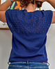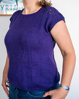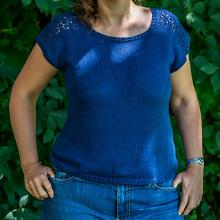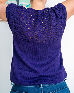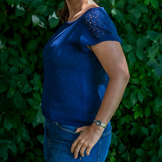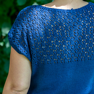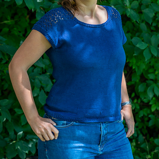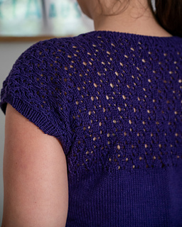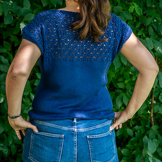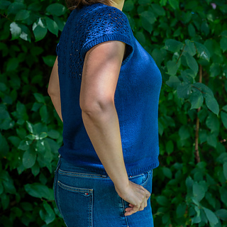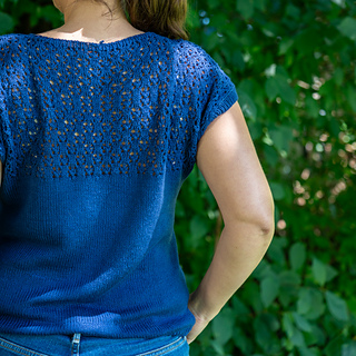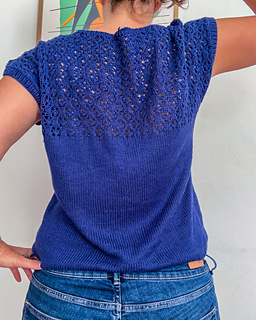 The tee is knitted seamlessly from top to bottom. However, since we have the pattern not only on the back but also on the front shoulders, we start at the neckline in the front. First, one shoulder is knitted upwards from the neckline, followed by the second shoulder. These two are then joined at the back and the hole pattern is continued down to the armholes. For the front, the stitches are picked up again at the front shoulders and these are also joined. This creates a square neckline. To keep the Tee bra-friendly, however, we now continue in stockinette stitch at the front down to the armholes. The Tee is then closed in the round and knitted down in stockinette stitch. The Tee is finished with a ribbed cuff. The length of the body can be adjusted individually.