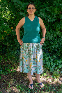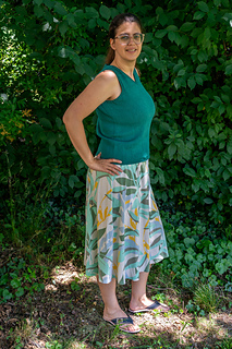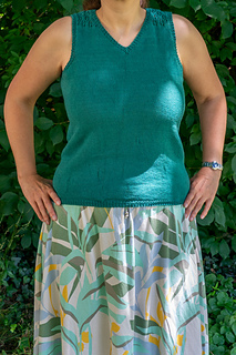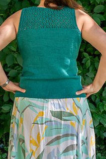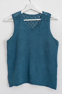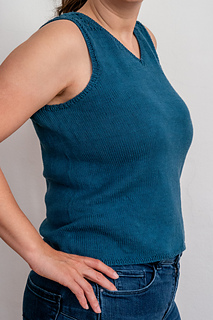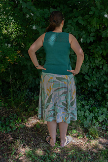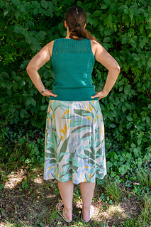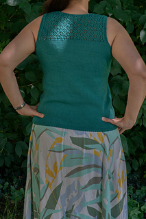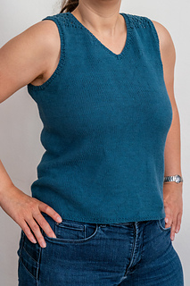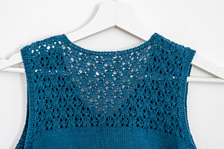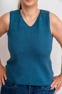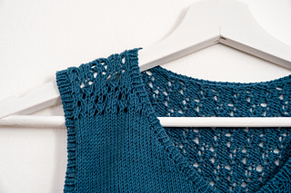 The top is worked from the top down so that you can adjust the length to your body. First, the back is knitted in rows with the lace pattern. Then the left and right sides of the front are worked separately. We start again with the lace pattern before switching to stockinette stitch to hide the bra straps. The V-neckline is worked at the same time. After the armholes, the piece is closed in the round and knitted in stockinette to the desired length before finishing with a simple ribbed band.