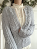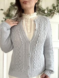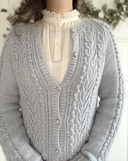 The Seashells Cardigan is a vintage inspired design featuring a decorative lace pattern along the front edges and sleeves.