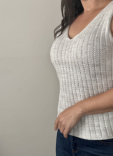 The top is knit top down with mirroring front and back sections. Provisional cast on is used to create a seamless shoulder. The V-neck and armhole shaping for each shoulder can be followed on charts or written instructions. The two shoulders are then joined and worked together to finish shaping the armholes. Repeat the process for the back. Join the front and back by casting on underarm stitches and working in the round to the desired length. Finish with I-cord edging at the armholes, V-neck, and bottom edge.