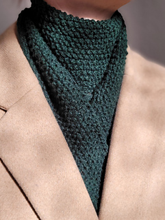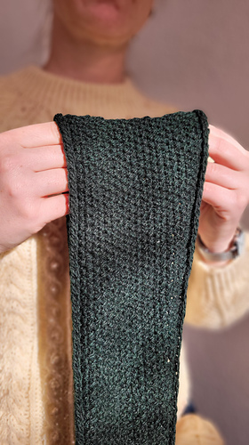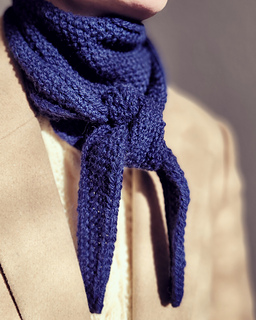 The scarf is knitted flat in a seed stitch pattern with increases and decreases on one side and a decorative rolled edge. So, both sides of the scarf are identical, giving it an elegant textured look. The instructions are suitable for experienced beginners.