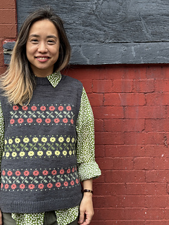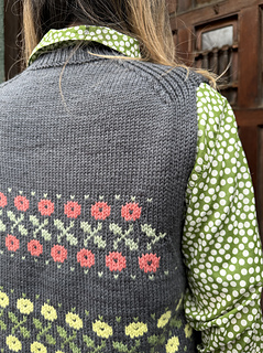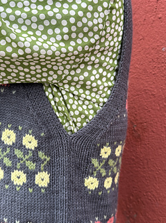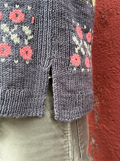 22 sts and 30 rows on size 4.5 mm/ US 7 needles over 4 in/ 10 cm in plain stockinette and colorwork worked flat after blocking.