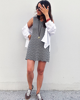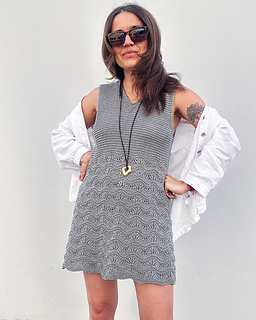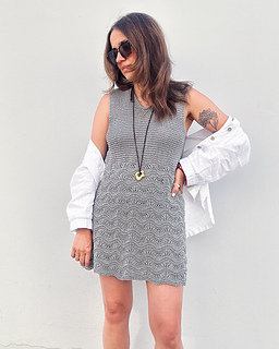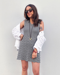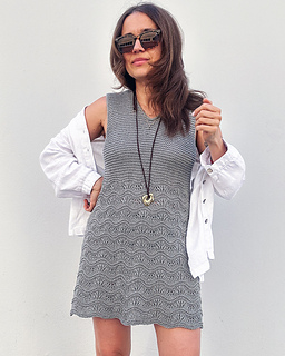 It’s designed with a V-neck, wide straps (perfect for covering bra straps), an A-line silhouette and a mix of Garter stitch on the yoke and Wave pattern on the bottom of the dress.