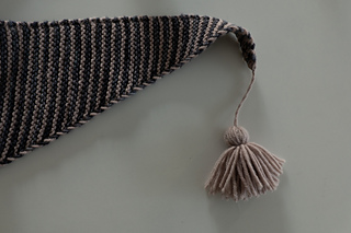 This shawl begins with 3 stitches and widens into a triangle through regular increases. Work the increase section to the desired size, then finish with decreases for a balanced shape. After completion, add tassels for a decorative touch. The size can be adjusted based on the amount of yarn used, excluding the portion reserved for the tassels. Use half of the remaining yarn for the increase section and the other half for the decrease section.