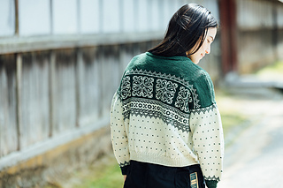 模様編みをしながらトップダウンで編むセーター. 後ろ身頃上部を往復編みで脇下まで編み, 前身頃は肩から目を拾い襟もとにスリットを入れながら脇下まで往復編みをする. 前後身頃を繋げて裾まで輪にして編む. 袖は袖ぐりから目を拾い輪で編む.