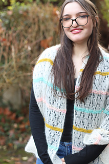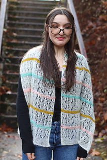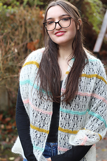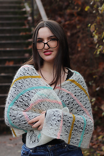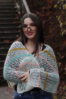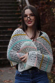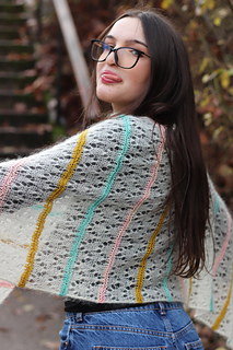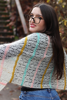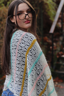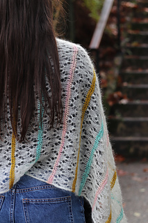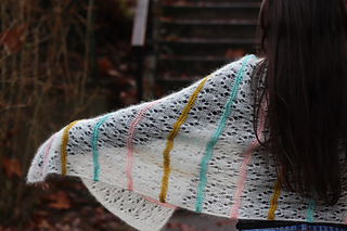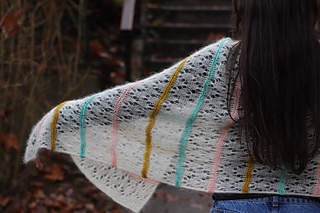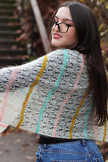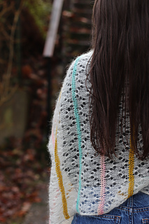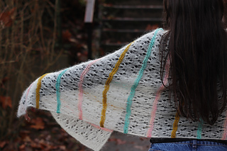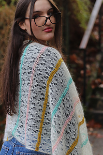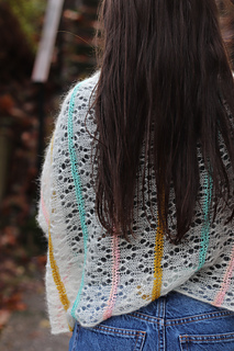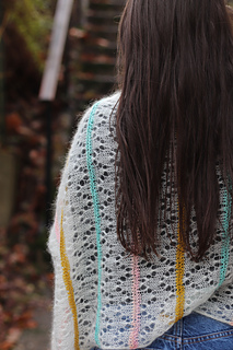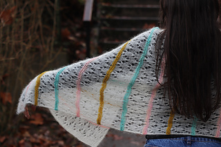La légèreté du fil est ponctuée, ici et là, de rangs contrastants, comme autant de fragments colorés venus troubler la blancheur immaculée. Ces éclats, tricotés avec trois mini-écheveaux aux teintes choisies, créent un rythme doux et inattendu, un fil conducteur discret dans cette pièce vaporeuse.