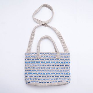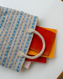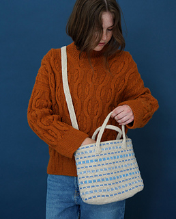 The Seley Bag is crocheted in a woven pattern using spike stitches in different yarn qualities, creating a playful texture. The bag has an oval shape, short handles, and a long shoulder strap. The main yarn is Highland, which highlights the technique and the play of colours and textures.