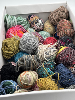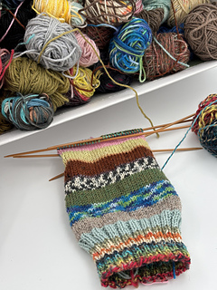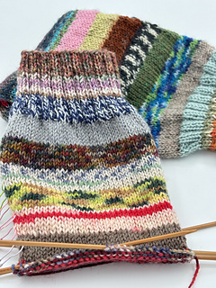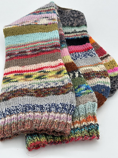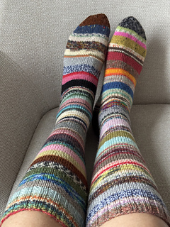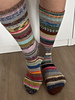 You can use 90-120 grams of any scraps of 4 ply sock yarn you like, with a gauge of 30x42, by 10x10 cm. When you choose a sock yarn with a gauge of 28 x 40 the socks will be a little wider.