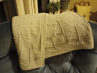 The knitted blanket consists of 3 sections. The first section features a tree motif (2 snowflake options are included), the middle section features a snowy sky and the blanket ends with a mirrored tree section (2 snowflake options are included) or a wavy section (no trees).