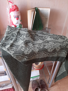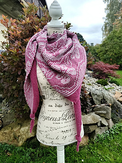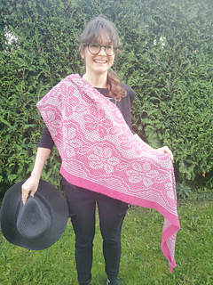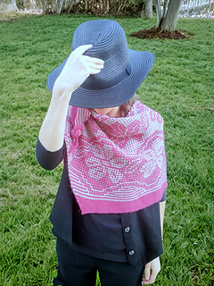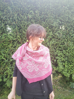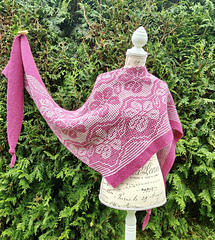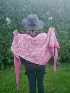 The design combines classic garter stitch with floral mosaic sections worked without carrying two colors at the same time. This makes the knitting process rhythmic and enjoyable while allowing the finished shawl to drape beautifully over the shoulders.