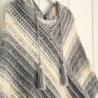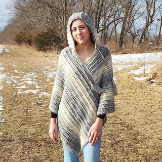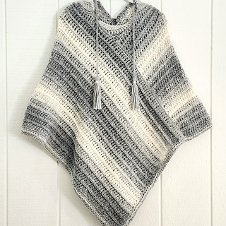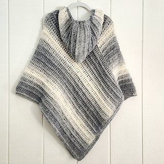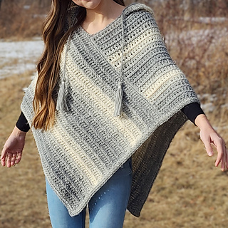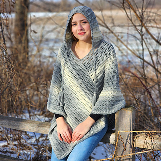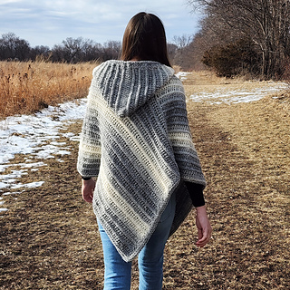 The Shadow Line Poncho works up fast using bulky weight self-striping yarn and a size L/8mm crochet hook. The poncho is crocheted in two large rectangles that are seamed together. The hood is crocheted along the neckline, and a simple edging is done around the bottom edge of the poncho.