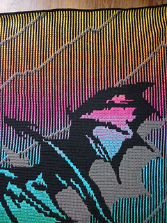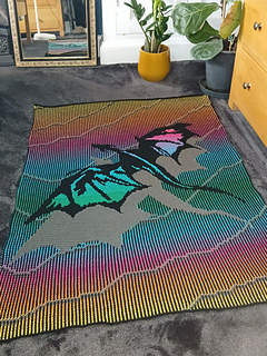 The colour changes from the ombre yarn shown in the photos was achieved by buying two cakes of ombre yarn (500 metre and 800 metre) and working from the inside out on one cake and the outside in on the second cake, this then gives the effect of yellow, orange, pink, blue, green, blue, pink, orange, yellow and end. If you use a single cake (1300 metres) your colour change will go from yellow, orange, pink, blue, green and end. The pattern has a few more rows than you will probably need to get to the end of a cake (I finished at row 296).