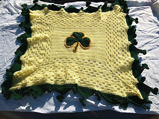 This was a request from a coworker. He asked for the tablecloth for an end table that he planned to put a printer onto. He requested a three-leaf clover in the center of the tablecloth. He also wanted to have edging on the tablecloth that hung down the sides of the end table with shamrock accents on it. He requested the colors that were used. The body of the tablecloth can be made using any color.