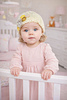 This sweet and simple knitted baby hat is a beginner-friendly project, worked flat and seamed at the back. The hat features a classic double rib texture and is finished with charming crocheted flowers and optional bead accents.