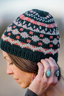 Design & Construction: The Shaniko Hat is a classic beanie featuring small-scale, southwestern-inspired motifs designed with newer colorwork knitters in mind. Only two colors are ever used per round, motifs avoid long floats, and all decreases are worked between colorwork sections to keep the knitting intuitive and approachable. The brim feature classic 1x1 ribbing for a clean, structured edge.