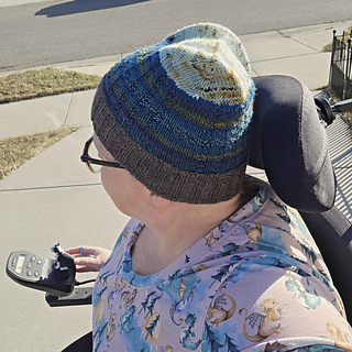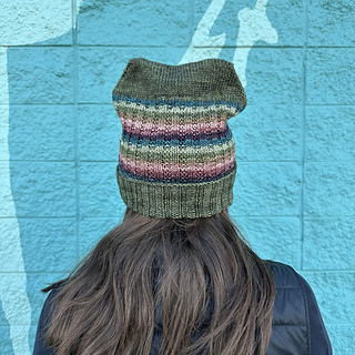 Sample shown in Hibernating set (self-striping + tonal). Self-striping: 117 yd / 107 m (38 g); green: 96 yd / 87 m (31 g). Sample is Size 2 with folded brim.