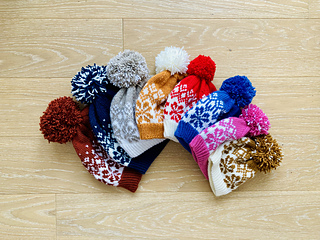Knitting in the round, color work, pompom
