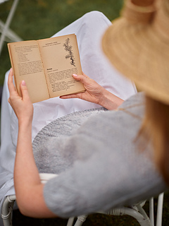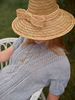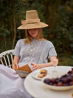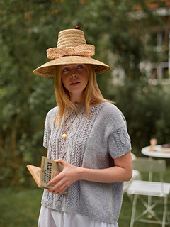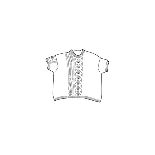 The Shell Song tee is inspired by the gentle rhythm of the sea, with flowing cables and delicate lace that evoke the patterns of seashells and ocean waves. The tee is knitted seamlessly from the top down, featuring a lace and cable pattern on the front and sleeves. It has a relaxed, boxy fit with dropped shoulders, giving it a casual yet elegant silhouette.