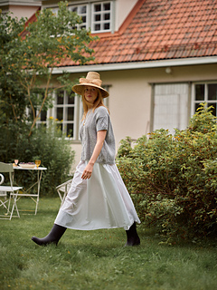 The tee is started at the back neck and increased to the full width of the back. Stitches are then picked up for the shoulders and continued for the front, with the lace panel at the centre. The front and back are joined at the underarms, and the body is worked in the round. Stitches for the sleeves are picked up from the body and worked in the round, with a bit of short-row shaping at the sleeve caps to improve the fit and a narrower lace panel on the sleeve tops. Stitches for the neckband are picked up from the neckline and worked in ribbing in the round. The hem, cuffs, and neckband are finished with a Sewn Tubular Bind-Off, providing a beautiful, stretchy edge that makes the stitches appear to roll over to the other side of the ribbing.
