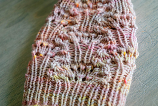 Gauge: 18 stitches and 30 rows = 4” by 4”/10 cm by 10 cm square on larger needles in lace pattern.