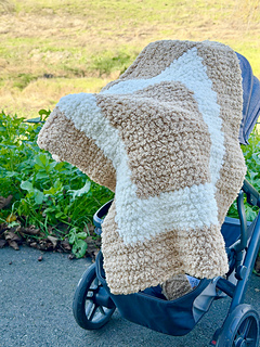 This Sherpa Stroller Blanket Crochet Pattern is made with Lion Brand Yarn Go For Fleece Sherpa which comes in multiple colors. It is a jumbo weight 7 yarn. Following the pattern instructions and using a 15 mm hook, this creates a 30 inch W by 35 inch H stroller blanket. The pattern is written in English with US terminology. It is a fun project using two colors to create inset rectangles. Put it in or over the stroller, wrap your baby up in it on a cold day or use it on the floor for your little one or even your fur baby. The super soft feel of this yarn is unmatched. You will find yourself wanting to use it frequently.
