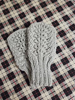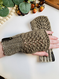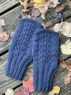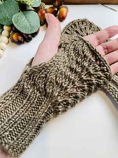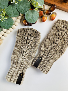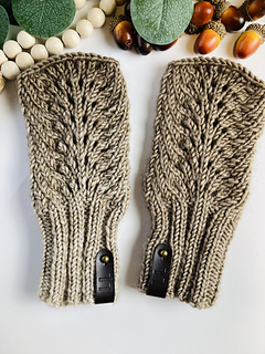 The pattern includes a stretchy 2x2 rib cuff, gentle lace repeat and easy seaming to create a comfortable fit for most adult hands. Designed in aran weight yarn, they knit up quickly and pair beautifully with gradual ombré or lightly variegated shades.