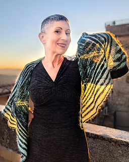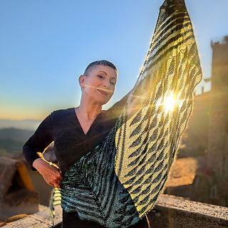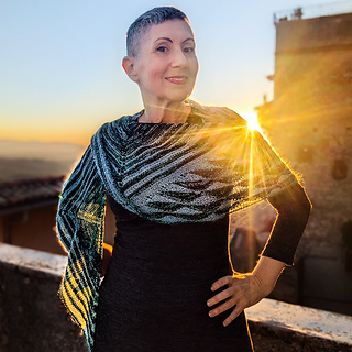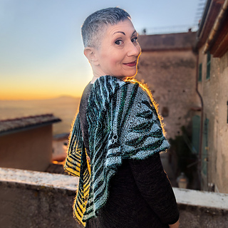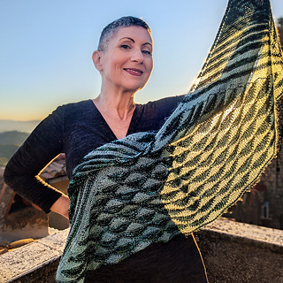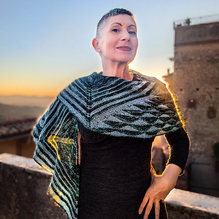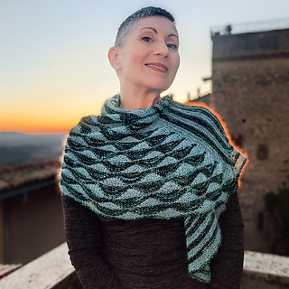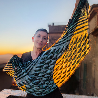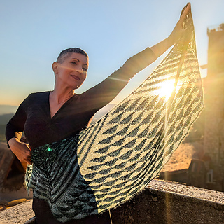 This is a modular crescent shawl, worked seamlessly in 3 different pieces. First the two big lateral triangle modules/mountains are worked, then they are joined together with the main part of the shawl that is knitted using a short-row motif reminding of soft hills.