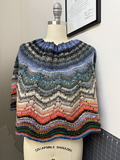 A modern capelet-style accessory. Designed to sit gracefully across the shoulders, it offers warmth without bulk and features a relaxed fit with graceful movement. It uses an elegant textured stitch pattern that is specifically designed to showcase the stunning self-striping color transitions of NORO Saiun yarn.