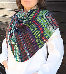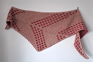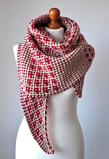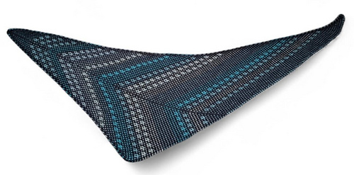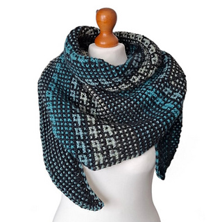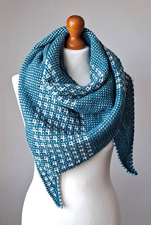 Shoal Shawl is an arrow-shaped shawl featuring a clean, geometric silhouette. It is worked sideways, beginning at the left tip and gradually growing towards the right edge. The two-color motif is created by changing the color of the yarn every two rows and using a combination of knit stitches and slipped stitches.