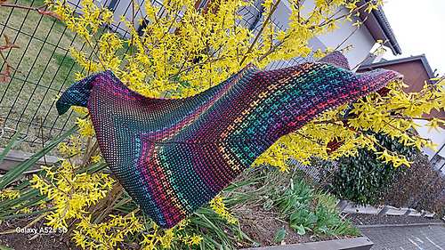 The pattern includes instruction for making 5 regular variants with 4, 5, 6, 7 or 8 rows of the fish motif and one improvised variant. Thanks to this, you can use yarns of any weight and gives you full control over the final appearance and size of the shawl.