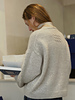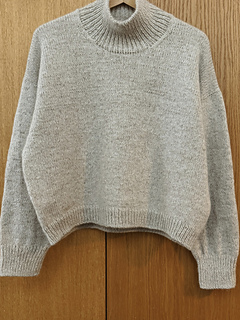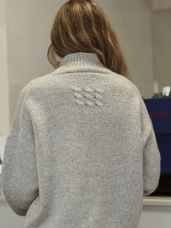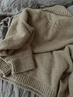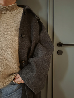 An oversized turtleneck characterized by softness and calm proportions. The cable detail at the back reads like a personal mark, reminiscent of a label left by the tide on the shore.