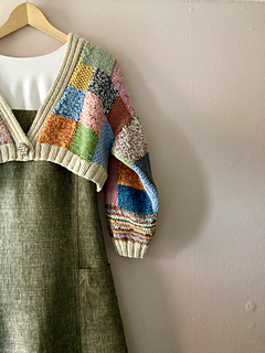 This is a charted pattern to make a one size cropped patchwork cardigan. Using a variety of colour blocks and textured stitches, this is a great project for using up odds and ends of yarn from your stash.