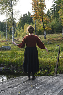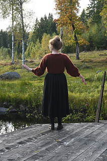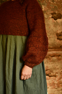 Tröjan stickas i slätstickning uppifrån och ned på rundsticka, med förkortade varv i nacken. Ballongärmen pryds av ett hålmönster.