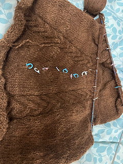 The V-neck is knit right into the design for minimal finishing with the cables outlining the profile. Saddle shoulders incorporate the asymmetric cable along the sleeve cap and shoulder line. The hem is whip-stitched in place forming a neat finish for the bottom edge and sleeves.