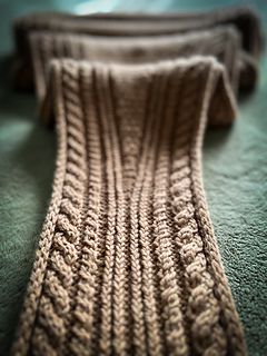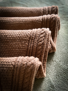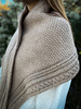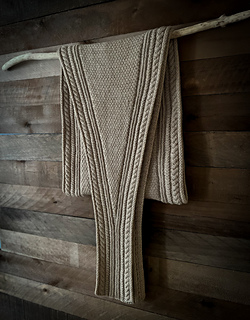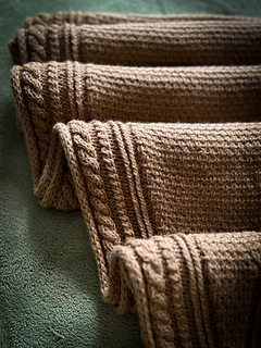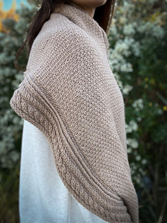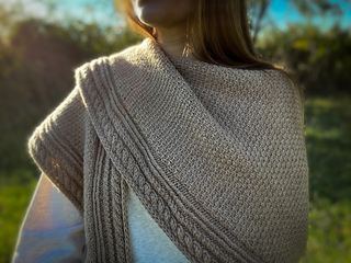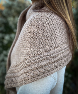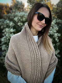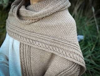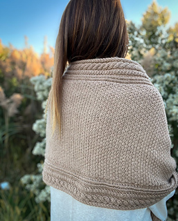 Along each edge runs a bold cable pattern, adding structure and a touch of timeless elegance. The body of the wrap contrasts the cables with a richly textured stitch pattern that catches the light and showcases the depth of the wool.