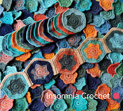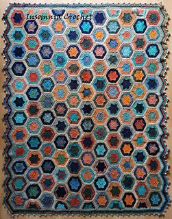 Crochet blanket featuring simple “star” shape motifs within hexagons. The pattern is suitable for most people with a bit of crochet experience.
