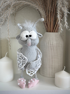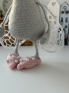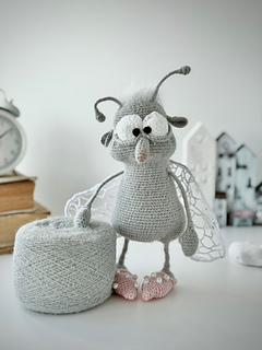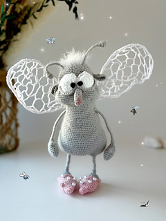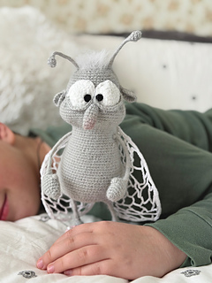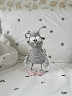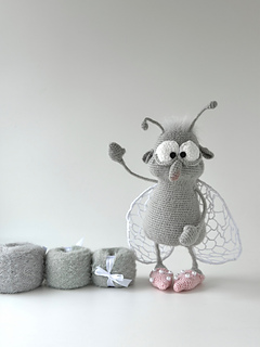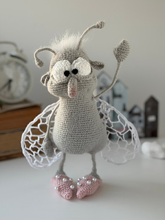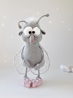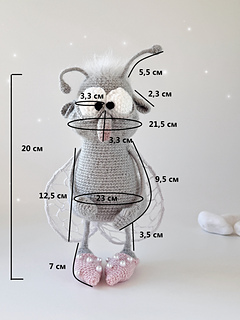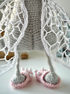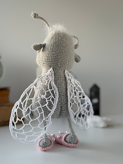 I’m about 20 cm (8 inches) tall. My body is grey and fuzzy, but you can make me any color you like. My wings are white and lacy, with a wingspan of 17 cm (6.7 inches). The tip of my nose is pink — yes, that tiny detail you’ll want to kiss.