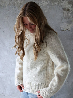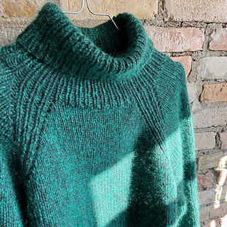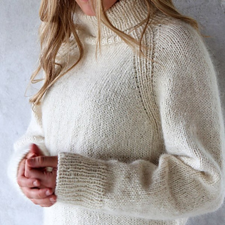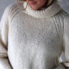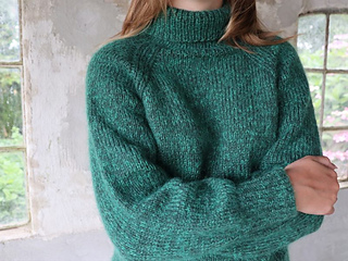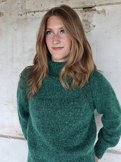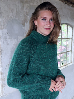 Silva Sweater is worked from the top down with a raglan construction. You begin by working a ribbed turtleneck, after which you continue in stockinette across the yoke while shaping the raglans. The raglan panels are worked in rib and these rib panels continue down each side of the body. The body is worked in stockinette and finished with a wide rib hem. Finally, the sleeves are worked with decreases placed evenly along the length of the sleeve and are also finished with a wide rib cuff. Bind off using a regular bind-off or an Italian bind-off for an elastic edge. The sweater is seamless.