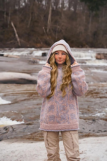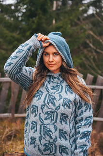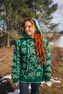 The Silvan Sweater is worked in the round, bottom-up, with rolled edges on the ribbing. The body and sleeves are worked separately before being joined on the same needle. The pattern from the sleeves and body continues up the yoke and is separated by the raglan decreases. When you reach the neckline, stitches are bound off at the center front, and the sweater is then worked back and forth. Finally, stitches are picked up for the hood, which is finished with a picot edge.