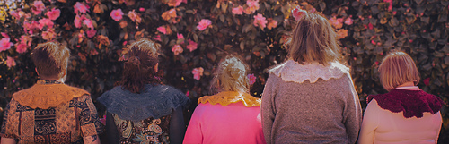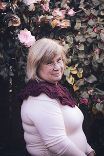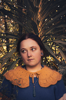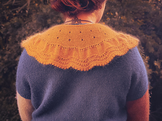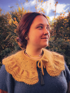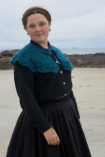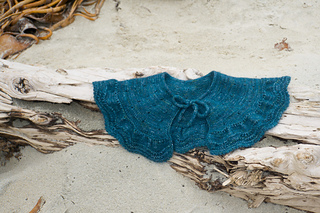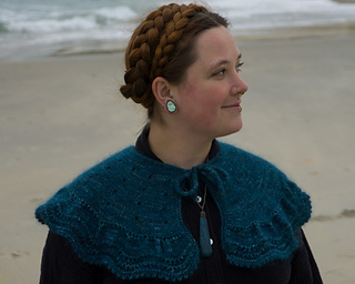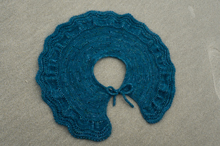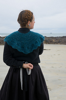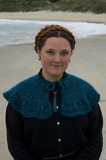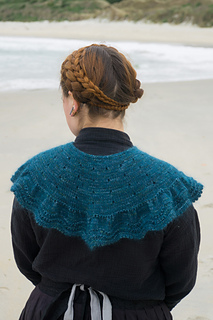The collar/cape is knitted from the top down with one strand of Ashford Merino 4ply/Dye Studio 54 Sparkle Sock 4ply, held together with one strand of Drops Kids Silk/Rowan Kidsilk Haze. I chose a light fingering weight (4ply) and a fluffy lace weight (2ply) to have a nice drapey fabric. You will start by creating an I-cord and then picking up and knitting stitches from the cord. The collar/cape is worked back and forth throughout with decorative and carefully placed increases. The final increase row will form ruffles, and the collar/cape ends with a wavy lace pattern and a beautiful picot edge. You can wear the cape over a blouse or a plain pullover as an accessory to embellish your look.